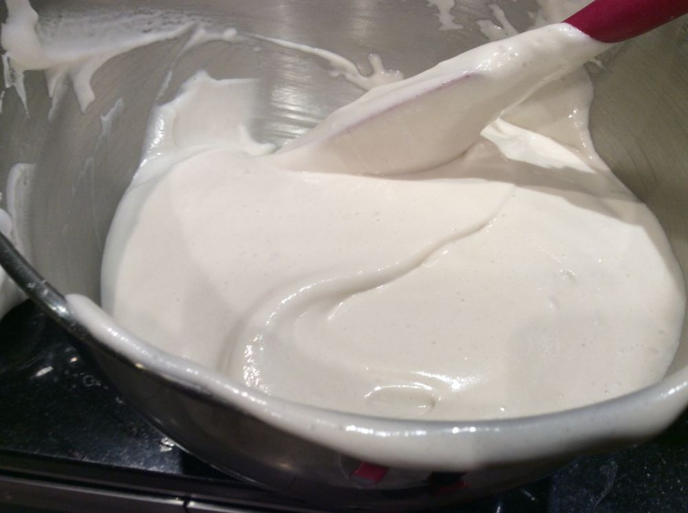 3,降低打蛋器的速度到中底速(KA厨师机的4档),沿着打蛋容器内壁,缓缓倒入高温糖浆到蛋白中,倒入时,糖浆呈细线状流入,糖浆全部倒完后,持续中速打发蛋白硬性发泡,蛋白坚挺直立。