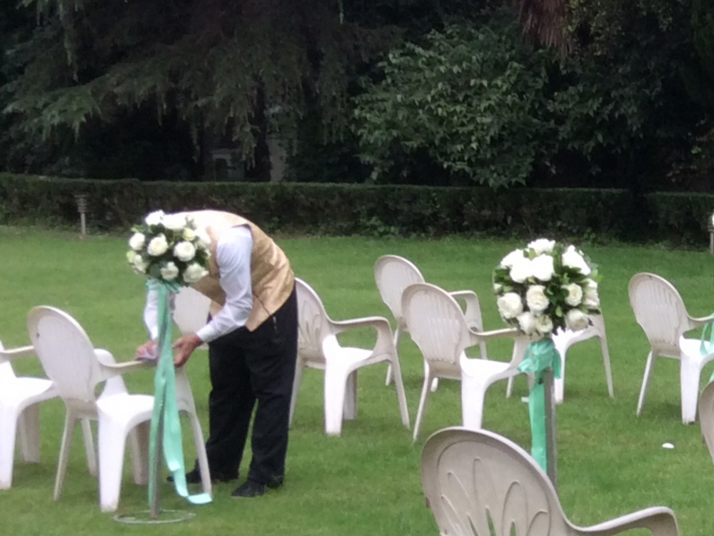 龍柏飯店大草坪,在專心致志布置婚禮現場的工作人員,不知道一不小心被誰戴上了一頂花帽子。