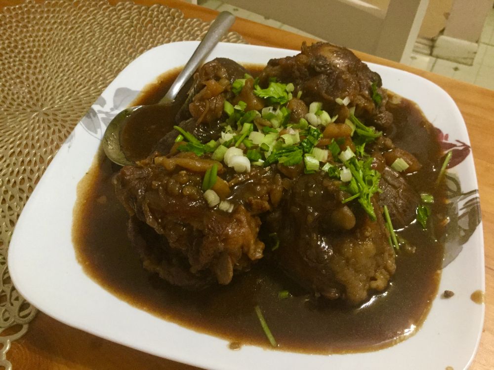昨天又照葫芦画瓢,做了这道菜。先在放了一点油的锅里把牛尾段的每面煎了一下,再用Maple Syrup做糖色(免了炒糖色这一步)。其它作料选你喜欢的味道放。放入砂锅加一罐啤酒慢火炖至肉骨分离即可(約1.5小时)。喜欢吃土豆的我,在出锅前20分钟放了一些土豆块,洋葱。最后浇一点芡出锅。