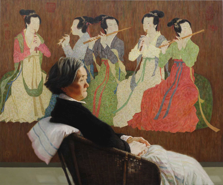 92年,我50岁生日,为寄托思母之情,参考照片画了一张肖像创作:“母亲”。选用“韩熙载夜宴图”中的一个局部来作画的背景,希望乐声能给失语的母亲带去心灵的欣慰。母亲脸上亮部的细节是凭记忆加进去的。