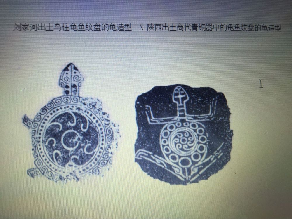 鸟柱龟鱼纹盘中的龟形图案,和其它地区相比也有了很大变化。《陕西出土商代青铜器》第一册中也收录了一件龟鱼纹盘,但是这二者相同的只是中心部分都有涡纹保持不变,(这为洛书中心构图的诞生准备了基础。)而龟的整个造型纹饰,前者远不及刘家河出土的鸟柱龟鱼纹盘。刘家河出土的鸟柱龟鱼纹盘的龟造型显然更具有艺术性,它和湖北盘龙城李家嘴墓出土的青铜盘大致是相近的。