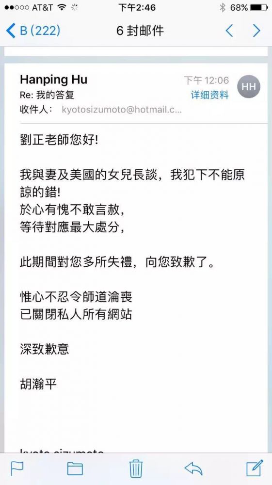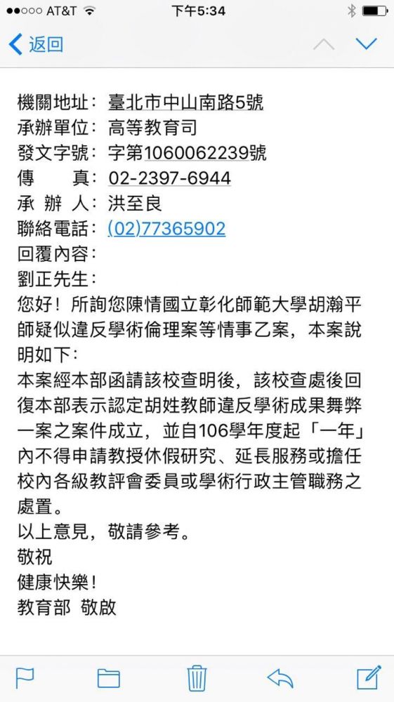今日意外收到台湾教育部给我的公函。去年十月我举报的台湾彰化师范大学教授抄袭剽窃我学术论著一事,查证属实!台湾教育部一并参考了我“查明事实、教育该人、不要解除该教授的职务和职称”的善意,通知了我对他的处理意见。