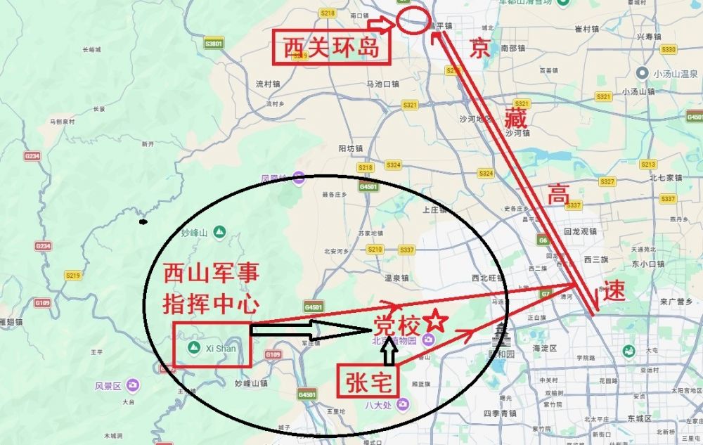 你把地图一摆,你就应该彻底的明白,编这个故事的人什么京藏高速抓张又侠,这个作者根本都不是北京人,你看我是北京人,我非常熟悉这一带的距离,我把这个地图、张宅、军事指挥中心、京藏高速、西关环岛,在这个位置上,从张又侠的家,往北开40公里到西关环岛干嘛去?!中央党校就在北京西山军事指挥中心附近,张宅也在那里,旁边就是中央党校,我们看这个图,我都给圈上了,如果是从张又侠在八达处的家,他直接往北就到了中央党校了,也就十分钟车程。如果他从西山军事指挥中心,往党校来,不会超过十五分钟,也就到了党校了,根本就没必要到京藏高速,更不可能要路过40公里以北的昌平西关环岛,你他妈这是蒙谁呢,给他妈的三个排比句好不好?这是孔庆东的话说,给你们三个排比句,知道什么意思吗?编这样的故事,还你妈的自称什么刷脸进中南海,你刷比都进不了中南海,你他妈的编什么呢,活该你找骂。