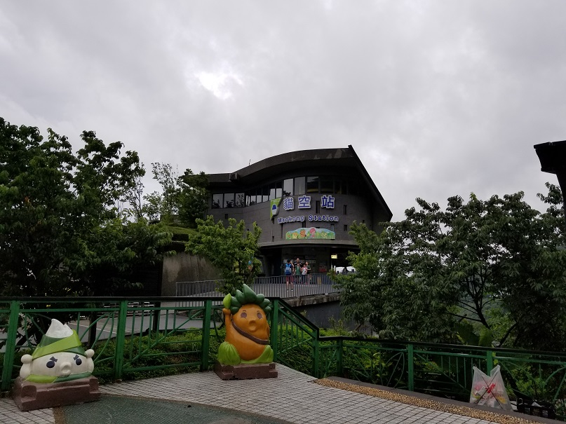 心满意足地离开了青康龙街区,我们决定乘捷运去猫空。话说期间还遇到一个小插曲,在永康街附近的银行兑换台币时我发现入台证不知道什么时候遗失了,第一次出外旅行遇到证件遗失,有些小焦虑。 不过想想总是有办法解决的,就暂时搁置调整心情享受当下先,后来事实证明,台湾确实是一个方便游客的地区,出境时在机场补办证件极为方便,又点一个赞。 捷运到动物园站下车后直接转缆车到了猫空,虽然路途中有些雨,上山后居然停了。话说在台北期间真幸运,去之前天气预报显示我们呆的一周每天都有雨,而且有强台风预警,没想到到达后的一周除了偶尔有些零星小雨外,还真没有遇到大雨。 去猫空的缆车上遇到一阵大雨,上到山顶居然停了,真的是人品好吗?呵呵。 这里就是猫空站的终点了。