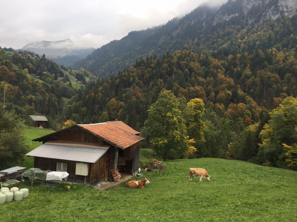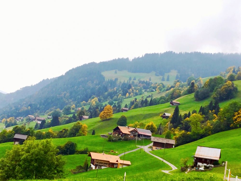 开往因特拉肯(Interlaken)的途中,车子突然偏离GPS指定的路线,误入一条蜿蜒上升的环山小道,左侧傍山,右侧为深不可测的谷底,车子完全没了退路。在前不着村、后不着店的深山里,我们任由山路引领。穿过幽暗的山谷,大约20分钟后,车前突然伸展开一大片惊似落入人间的世外景象:金粉般的秋色淡淡涂抹在海浪似连绵起伏的山峦,焕发出斑斓的色彩;茫茫白雾朦胧了层层叠叠的山峰;在一望无际的绿色山坡上,农舍和奶牛星星点点。我们在一间木屋墙上找到了地名,这便是名不见经传的哈布凯恩(Habkern )小镇。