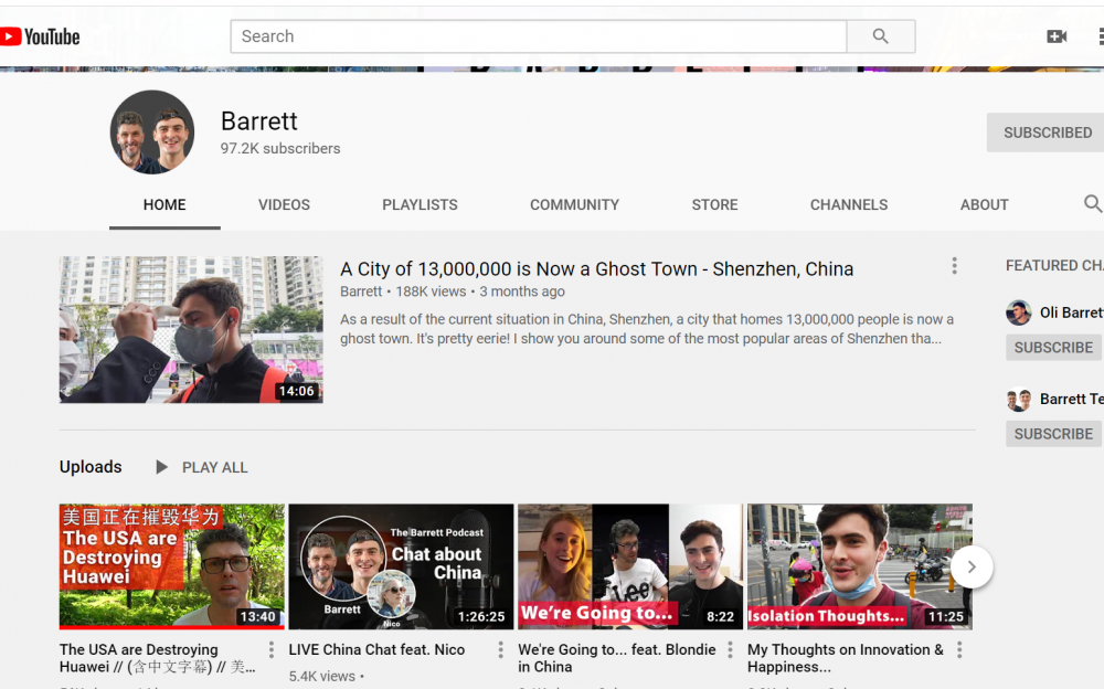 看看他油管视频的题目,通常都非常耸动。比如《喜欢还是仇恨中国》《共产主义中国》《中国健康吗?》。