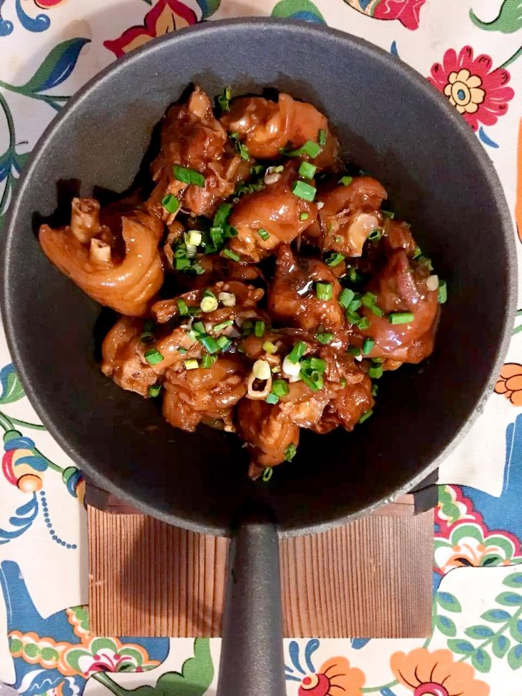 先放少许油,小火炒碎冰糖炒到橘红色的时候,锅离火,放入猪蹄翻炒。加入料酒,姜,葱团,盐,花椒少许,八角,香叶烧开后去掉浮沫,大火烧开移至小火炖烂,准备收浓汁的时候放盐调味,最后少许葱花。