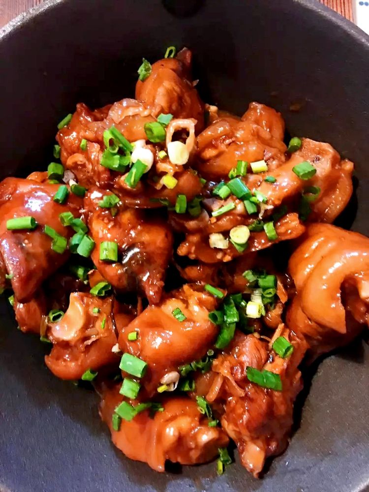 猪蹄,酱,葱(一部分团成一团,其他切葱花),冰糖砸碎,八角,香叶 ,料酒,少许花椒
