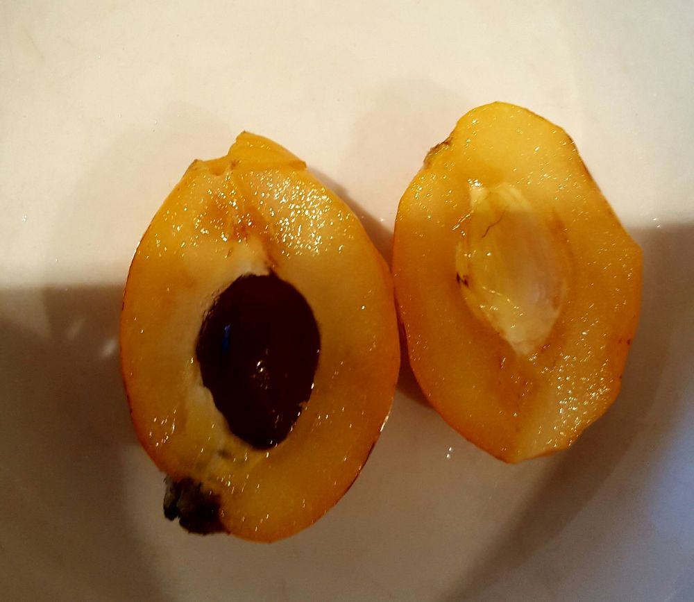 枇杷里的核不但大,而且是一枚果里有多个核,这样果肉的比例并不大。今年我在这棵树上收获了一批橄榄型的枇杷,这种形状的枇杷都是单核,肉质厚甜。这种枇杷是长在Gold Nugget的枝条上的。
