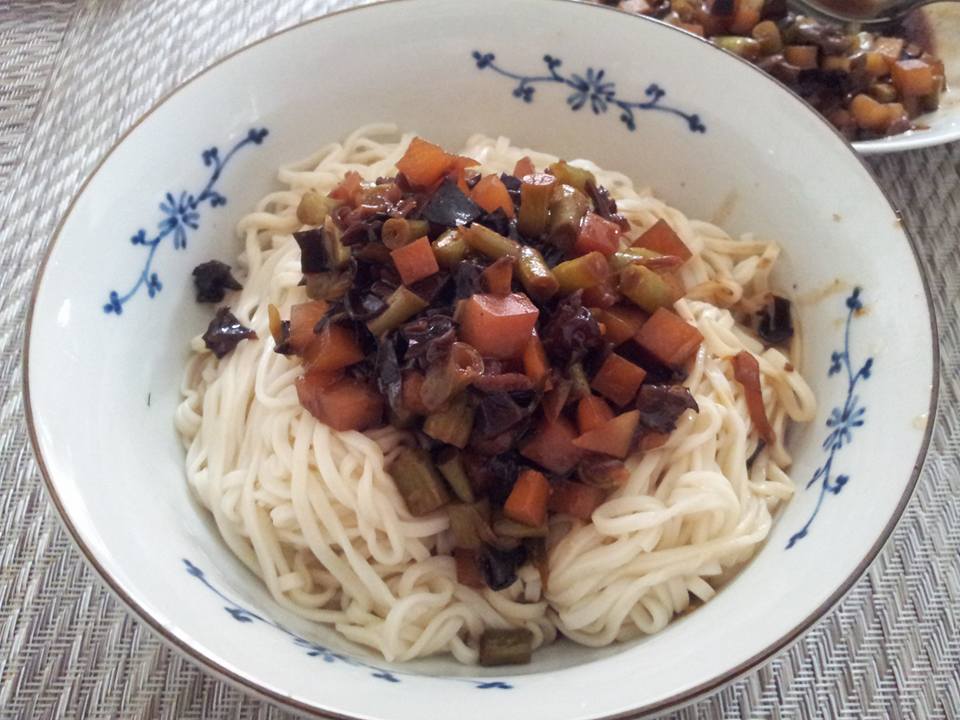 豆角,土豆,胡萝卜,木耳,切丁,加两勺豆瓣酱,做卤。