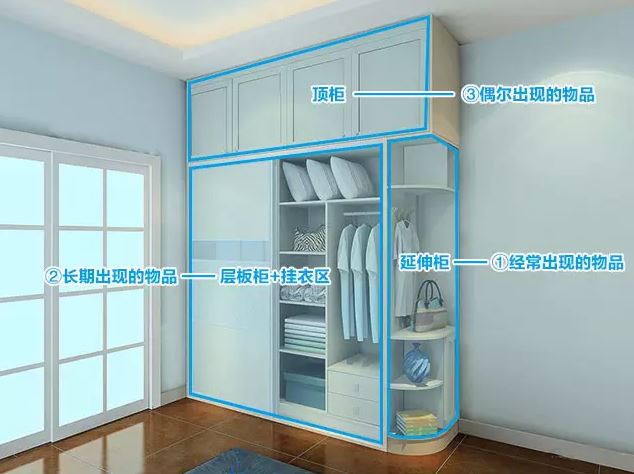 用延伸柜收纳睡衣、袜子这些使用频率高衣物的:1、让拿取更方便,2、专属收纳让房间更加整洁。衣柜的设计重点在于层板柜和挂衣区面积的大小,下面介绍一款适合普通大众的衣柜内部设计: