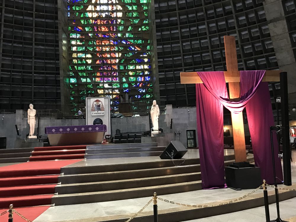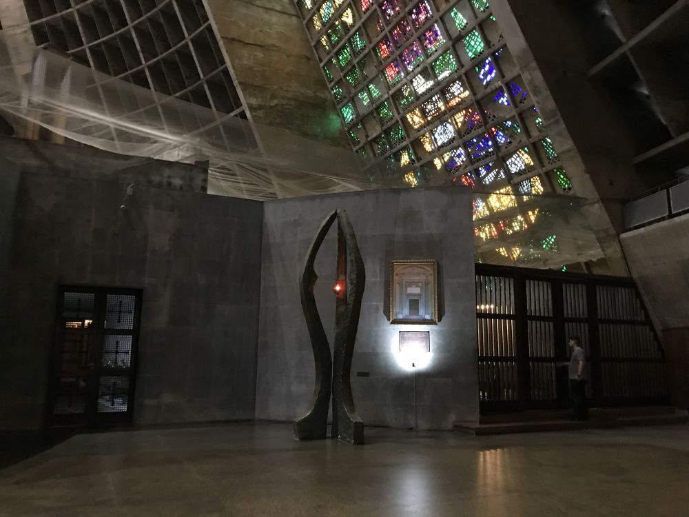 离开桑巴大道,行驶数分钟后,大巴停在一座耸入云天的现代化建筑前,她就是里约大都市天主教堂(Rio de Janeiro Cathedral)