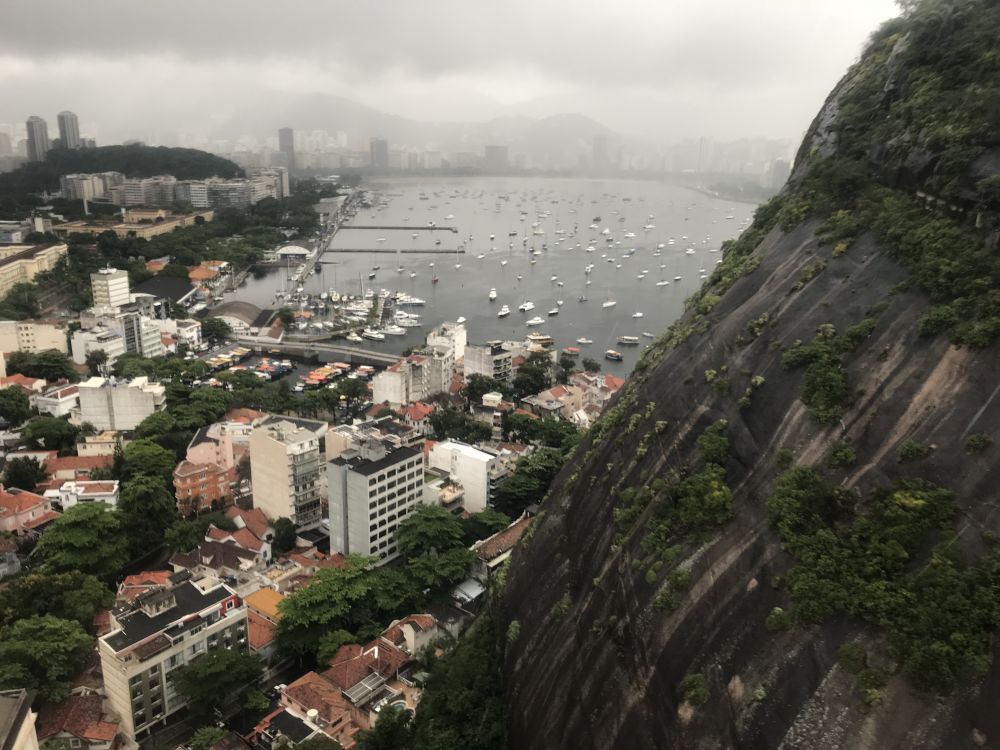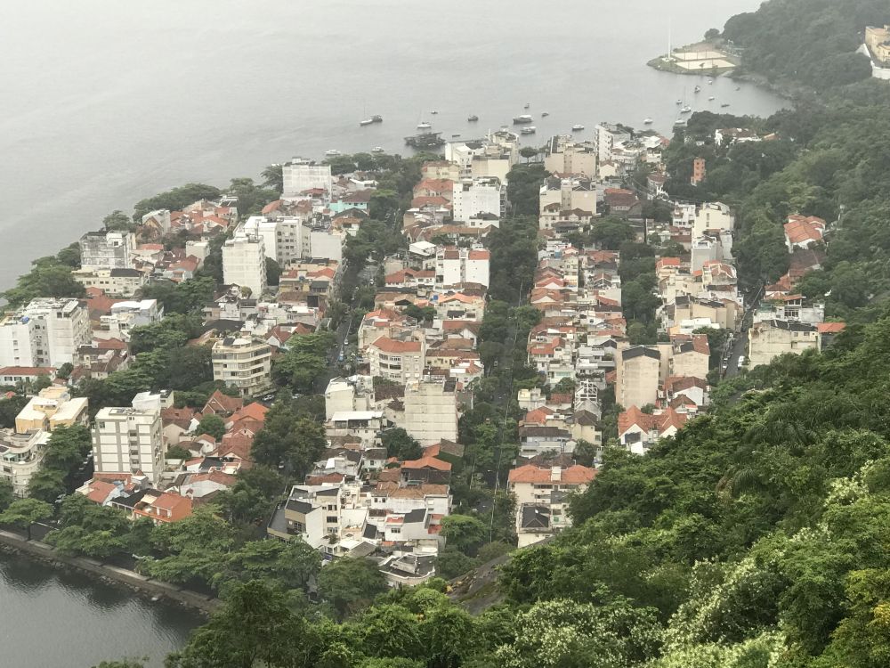 缆车贴着糖面包山缓缓上升。山脚下的景色演变成一幅幅色彩斑斓的拼图。那片老建筑是1808年建造的贵族学校;停满各色船艇的水边是游艇俱乐部;风格不同色彩鲜艳的五颜六色建筑,是富人的别墅和里约著名的大学院校区;高高的城堡是1565年为保卫里约市建造的圣若奥古堡;一座大桥跨越海湾连接里约到巴西的另一个城市尼泰罗伊。