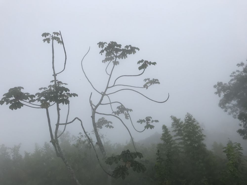 天空飘来一阵雨。雨雾在天台上蔓延开来,大雾渐渐笼罩了平台。刚才还看得见山影,待我们到达山顶平台最高处时,周围已白茫茫成一片迷朦世界。人落入浓浓白雾里,仿佛腾云驾雾一般,顿感飘飘忽忽,如入仙境。