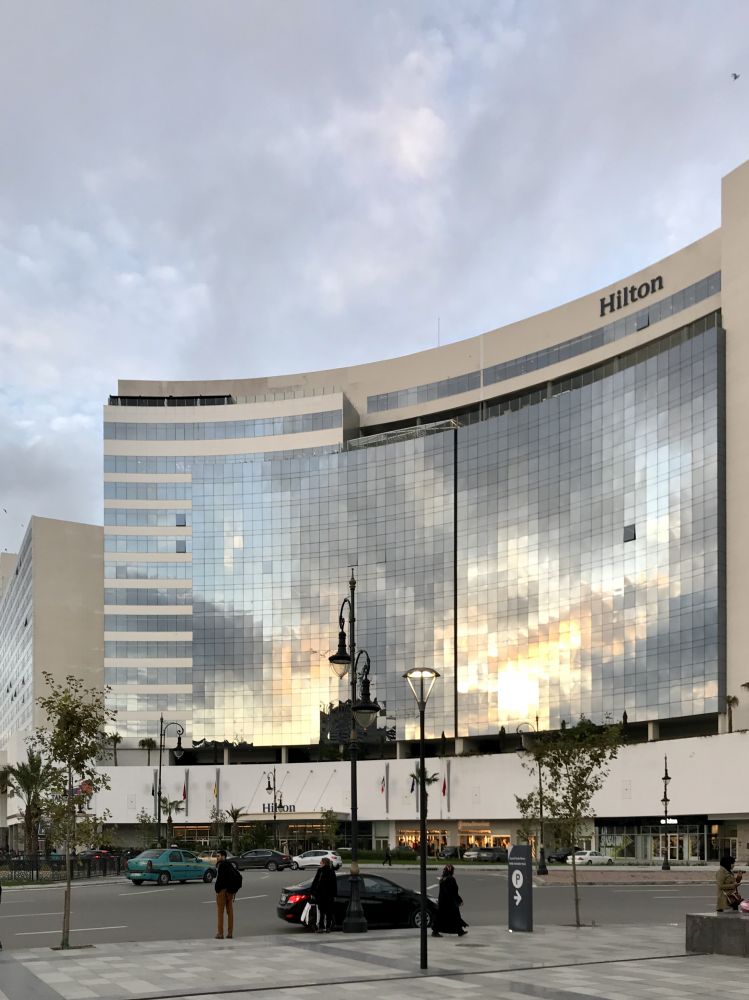 晚上入宿丹吉尔希尔顿酒店(Hilton City Center Place Du Maghreb Arabe)。酒店旁就是商城。赶紧去换钱。在摩洛哥,酒店餐厅都可以用欧元或美元。但身边一定要备一些摩洛哥零钱。方便店买小东西买水果,上厕所付小费,都得用摩洛哥钱。摩洛哥人直接向人讨小费,与当地人合个影也要给钱。一欧元大约兑换10.38摩洛哥迪拉姆(Morocco Dirham)。上个厕所1-3迪拉姆,丹吉尔厕所最贵5迪拉姆。