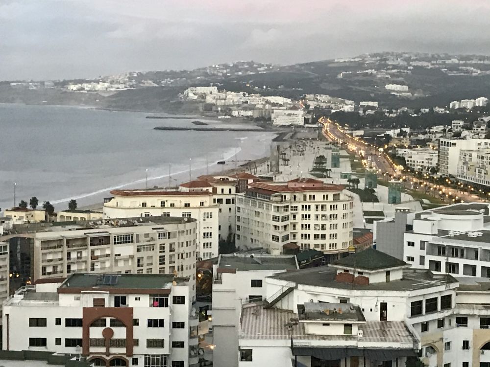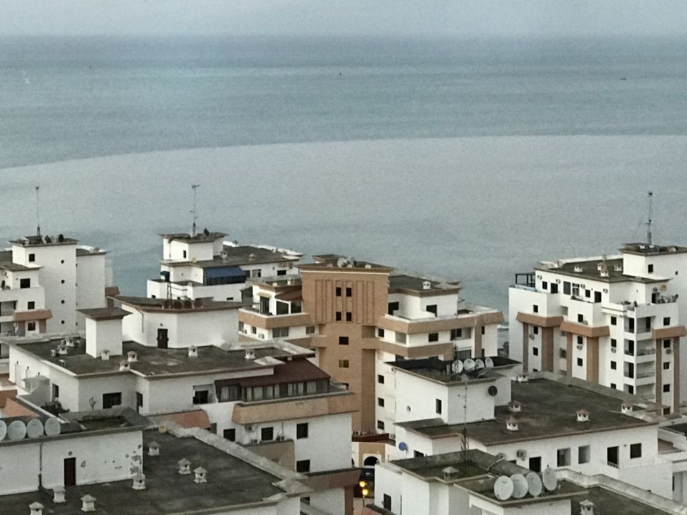 我们入住在坐落在海滨希尔顿酒店,十五楼自助餐厅的落地玻璃窗恰好观市景。山坡上密密麻麻的小房子是丹吉尔老城。山脚下一片大海,沙滩干净整洁。窗边已有两西班牙年轻人坐着喝酒观景。一见我,热情地用西班牙语“Hola”(你好)上了。