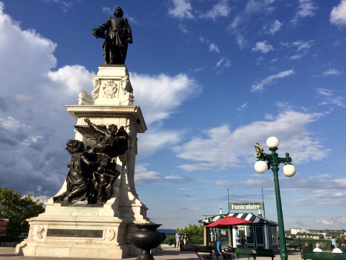 古城脚下,一群西人游客饶有兴趣听一个魁北克年轻人介绍古堡大酒店。“看,这是撒弥儿(Samuel)将军的塑像。当年就是在这座古堡,他带领法国人和印地安人