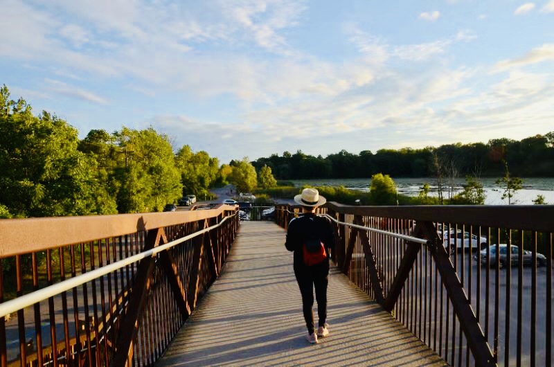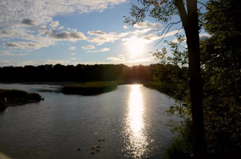 归途中,去红河谷公园另一端探探,跨过一座桥,又见一条绿树成荫的长长步道。没时间继续向前走了,站在桥上,欣赏水面的黄昏余晖。太阳渐渐落下,天上的太阳与水里的天阳连出一片漂亮的霞光。