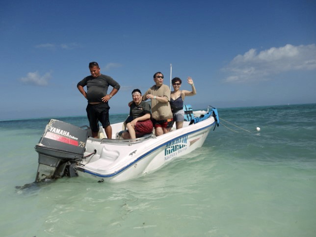 快艇由75匹马达带动。马达启动和停止时产生浓浓的机油气味。乘快艇船的感觉与双体帆船大不一样。因为速度快,风大而且快艇颠簸的非常厉害。屁股与铁座位颠撞得好疼。不过,乘风破浪的感觉很刺激。大约15分钟,快艇在古巴人称为海礁石崖的地方抛锚停下了。