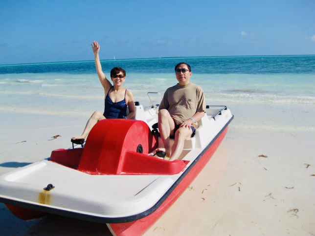 7点半起床。打开阳台门,阳光明媚且又没有风。终于没有风可以畅游大海了。吃罢早餐,直奔海滩打听海上活动情况。今天各种船只全部免费开放。我们决定先玩双体帆船。一问,已有人预定,赶紧订了10点的。