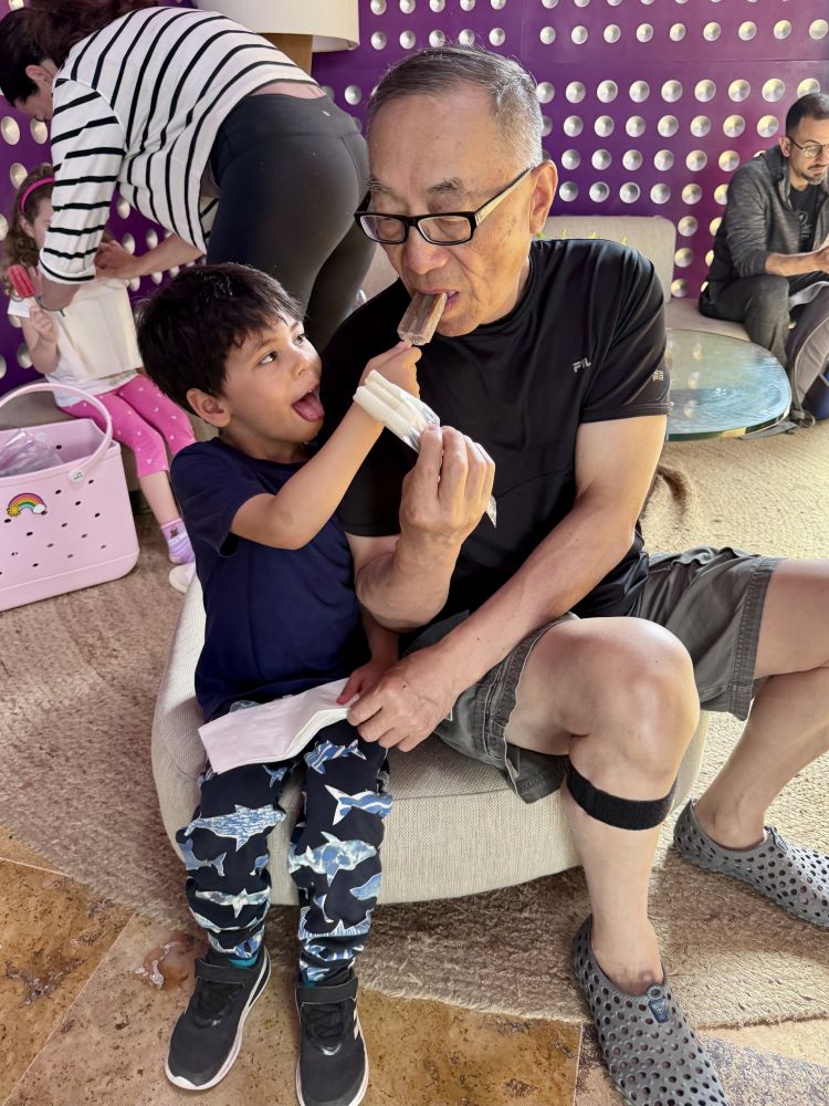 10点半check out,在等待女儿预定的私人小巴时,发现了冰棍。先生三二口咬完一根,就逗小家伙玩,让小家伙把冰棍让他咬一口。看祖孙两个吃冰棍的模样,笑死我了。