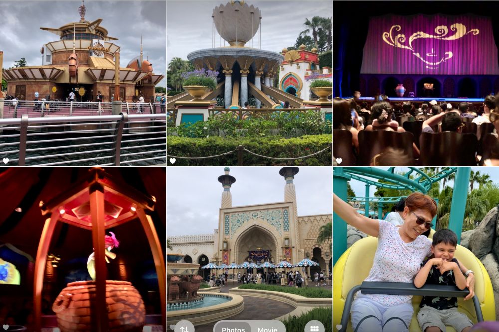 接着进入阿拉伯海岸,异域风情扑面而来。坐船随“辛巴达故事航行”,徜徉在歌声与宝藏的传说里。小船悠悠,一个个富有阿拉伯风情的画面在身边闪现。女儿很喜欢这个游戏,大热天里享受室内的一片凉意;坐在“茉莉公主的飞天魔毯”上,在华丽的王宫庭院上空盘旋。小家伙兴奋地搬动控制杆,上升下降地变换角度,尽情享受自由翱翔的潇洒;巨型圆顶建筑物的华丽穹顶下,一家人骑上“商队旋转木马”,在一派异国风情中,想象着阿拉伯骆驼马队在沙漠中的日日夜夜。