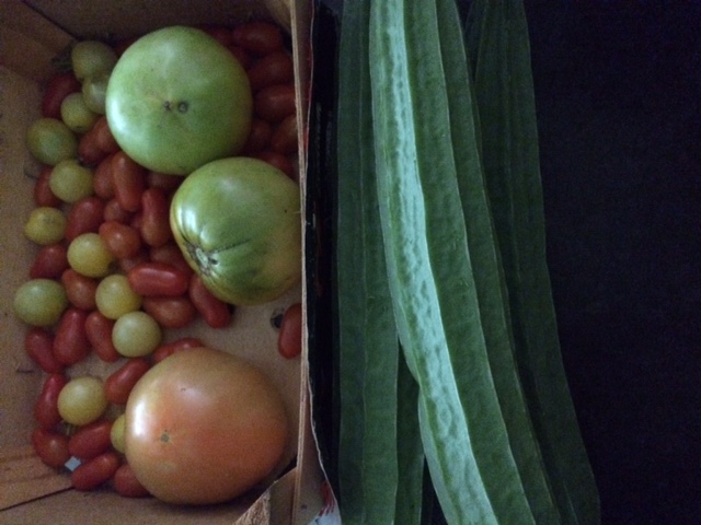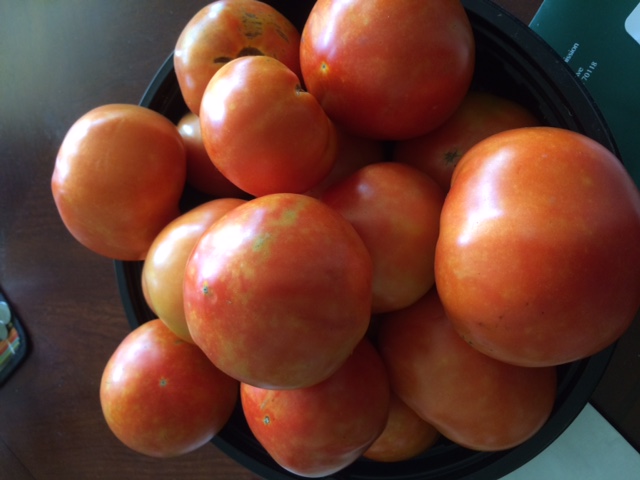今年的雨水主要集中在7月份,下的没完没了,日以继夜的下,大西本来结果不错,可是叶片开始生长霉斑,感染的蛮厉害,有一颗的所有叶片都被我剪去了,不知道大西能否挺过去,不过目前为止已经收获了很多西红柿。