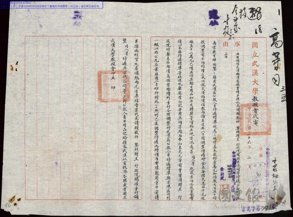 1946年起价格上涨更进入了快车道,国民政府制定了一些措施,教职员按物价指数分地区等级加成补贴,京(南京)沪地区还发放(生活必需)实物来抵御通胀。不过各地物价都在飞涨,一些地区的加成补贴已无法应对物价飞涨,那一时期,教育部收到的都是各校校长、教授会要求调整薪水待遇的函电。下面是部分函电的原件,报告了当地米价涨价的情况,有的函电更是直言若不提到待遇就要罢教了等。