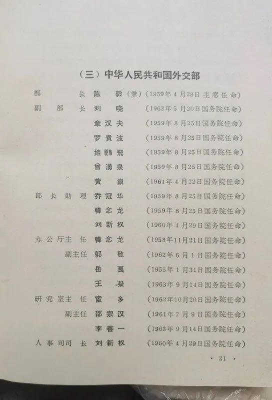 外交部是国务院的一个大部,不过副部长的人数也只有6人,为平均数,但外交部是少数几个设有部长助理,有3个部长助理。直属司局级单位18个,后来不少知名的大使或外交官在这名册都是副司长:如符浩、余湛、姚广、姚登山、宫达非、康矛召、陈楚、林平、宋之光。他们出任的国家大使馆大部分可认为局级(他们有的可能出任时提了级,有的离任大使回来就任司长了。