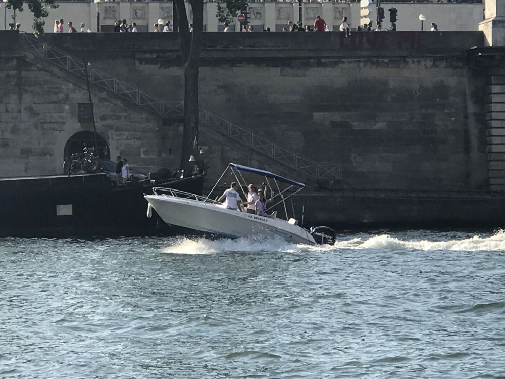 不一会儿, 大女儿她们的小艇从另一边桥下现出,我和小人儿边叫着姐姐的名字边拼命挥舞着手臂。小艇在对面减缓了速度, 但片刻之后便又疾驰而去, 很快在我们的视野中消失了。 菲说, 由于巴黎水上交通管制, 她们并不能停靠, 我们就只当是打声招呼了。
