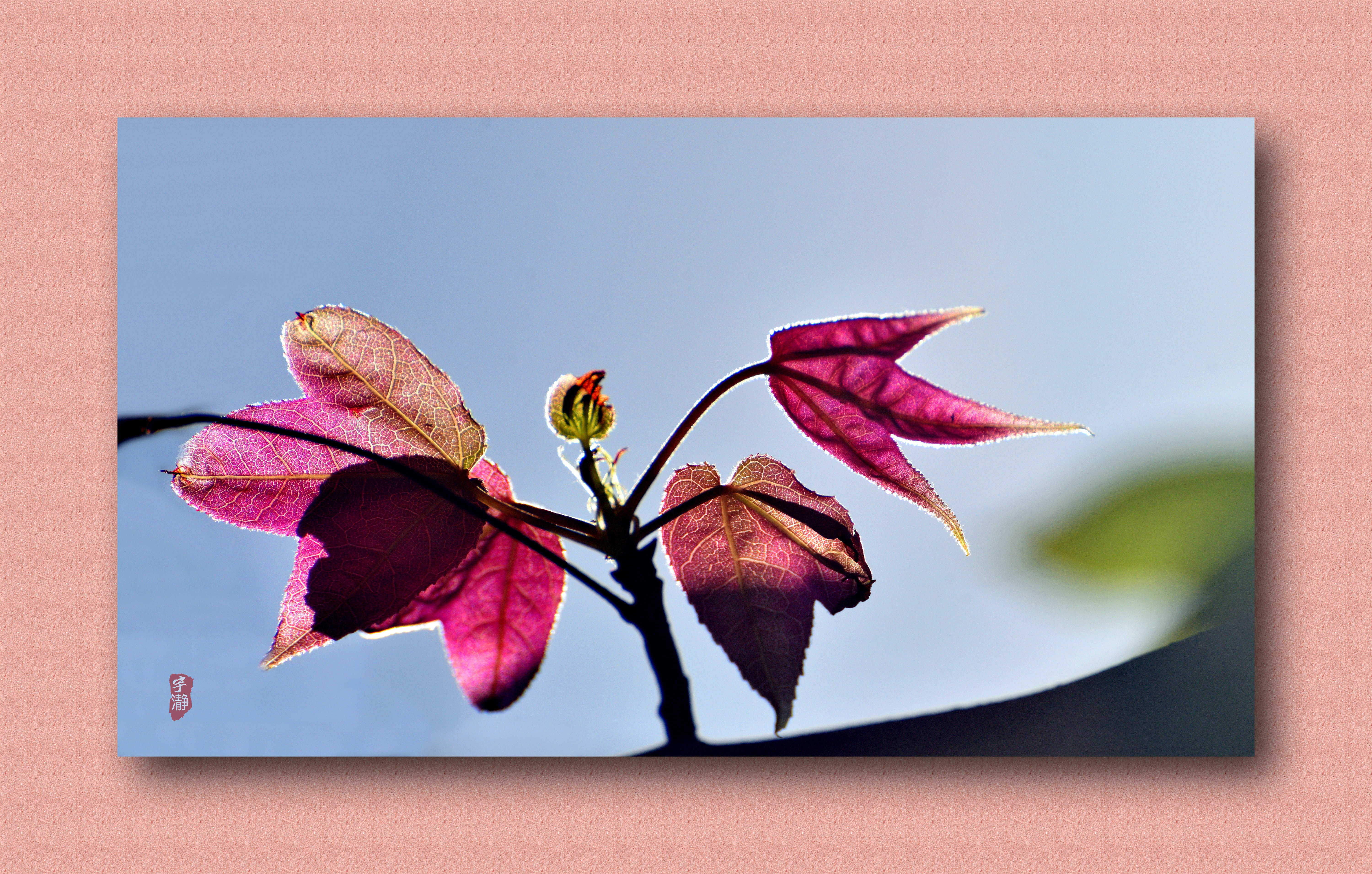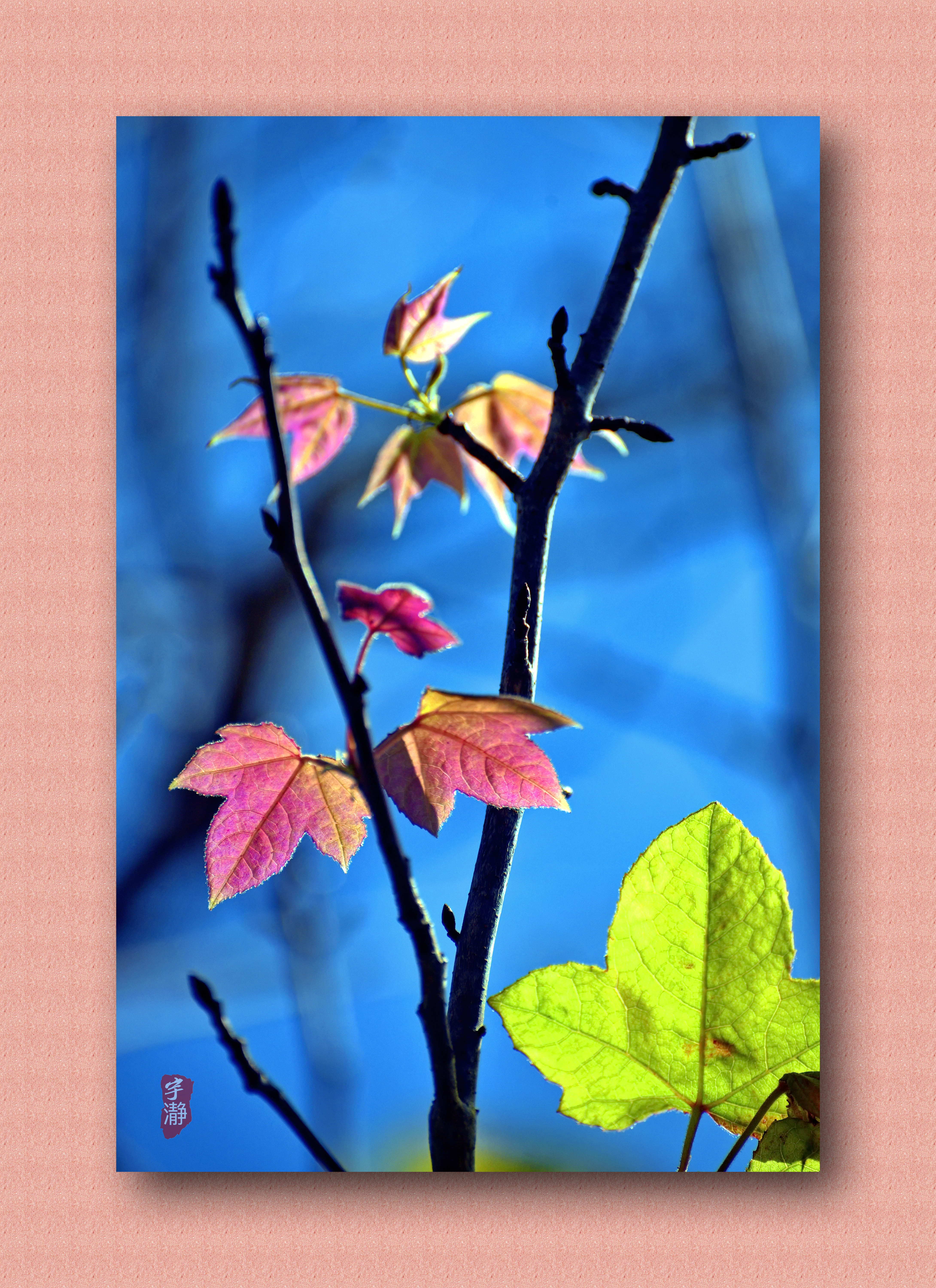 惊喜发现,树杈树枝间有数片粉红嫩叶,煞是好看。