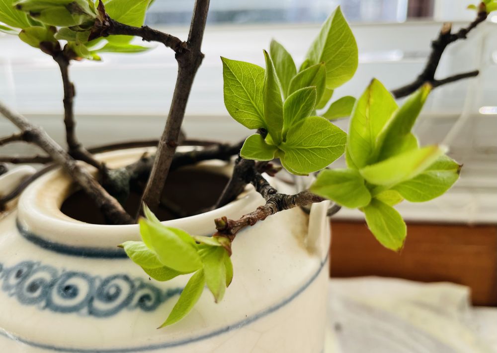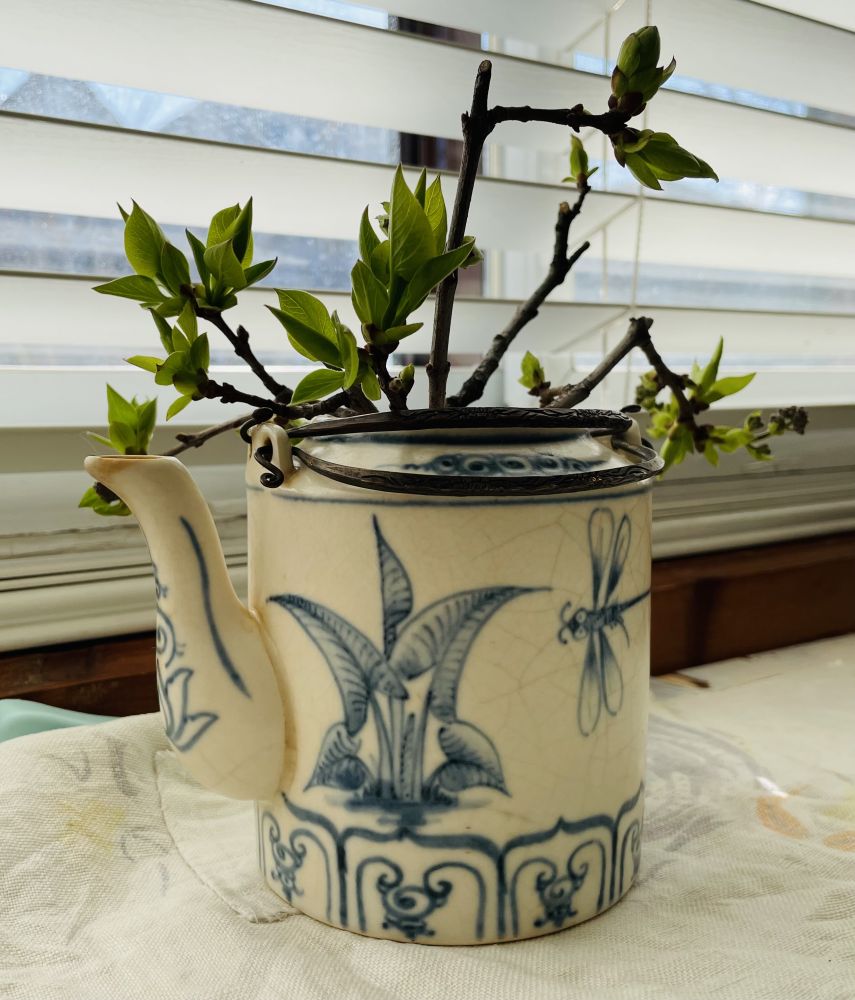 两周前爬梯修剪丁香枝,错剪下的插入玻璃瓶。忽然觉得何不插入“日本“茶壶,有侘寂风。