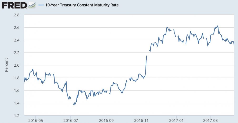美国通胀在1982年见顶,此后美联储主席 Paul Volcker 力排众议,大刀阔斧,将失控的通胀制服,从此债卷进入长达35年的牛市。图一显示美债十年期债卷收益率的长期历史变化,图中可见十年期收益率1982年见顶,之后进入下行通道,持续至今。十年期收益率去年一度跌破1.4%,但特朗普胜选后大幅反弹,一度涨破2.6%,现已跌回2.25%左右(见图二)。这次收益率骤升受特朗普再通胀期望驱动,很多人士认为债券长期牛市就此结束,债市将进入长期熊市,利率进入上行通道。债王Jeff Gundlach 认为十年期收益率在2017年可能升到3.0%(见《美债利率还能涨多少?》)。