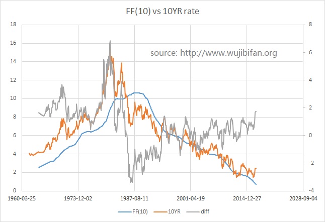 如果短期政策利率未来难升高,那么十年期债卷收益率会怎么样哪?十年期债卷收益率是市场对未来十年间短期政策利率积累均值的预期,因此也难升高。这点反映在图三,图中显示前十年短期政策利率的平均值和十年期债卷收益率的对比。图中可见在1990年以来,前十年短期政策利率的平均值和十年期债卷收益率相当吻合,后者围绕前者波动,目前十年期债卷收益率偏高。依据十年短期政策利率的平均值为指针,可以预料十年期债卷收益率上升空间十分有限。