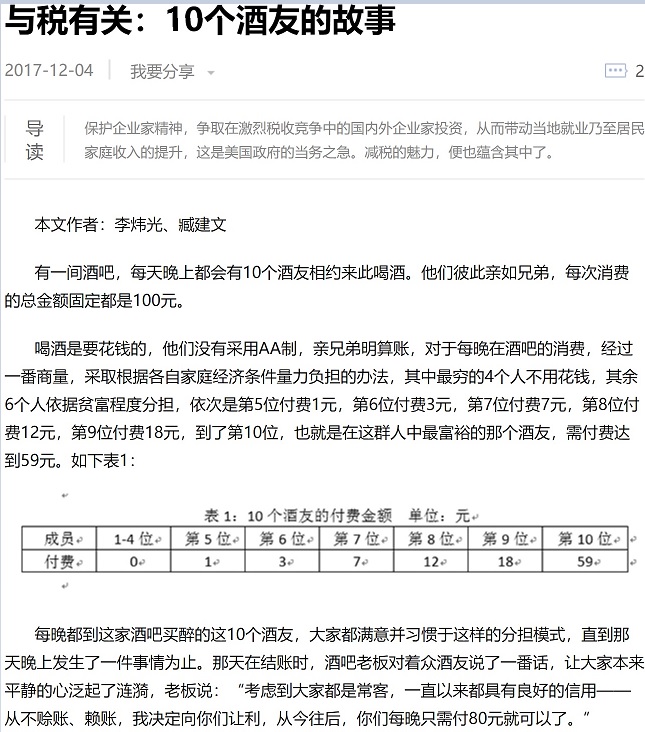 十个酒友的寓言故事其实和税改语境相差很远,套用得出的结论也很荒谬,但被迷惑的吃瓜群众不在少数,笔者感觉需要揪其谬误,以正视听。