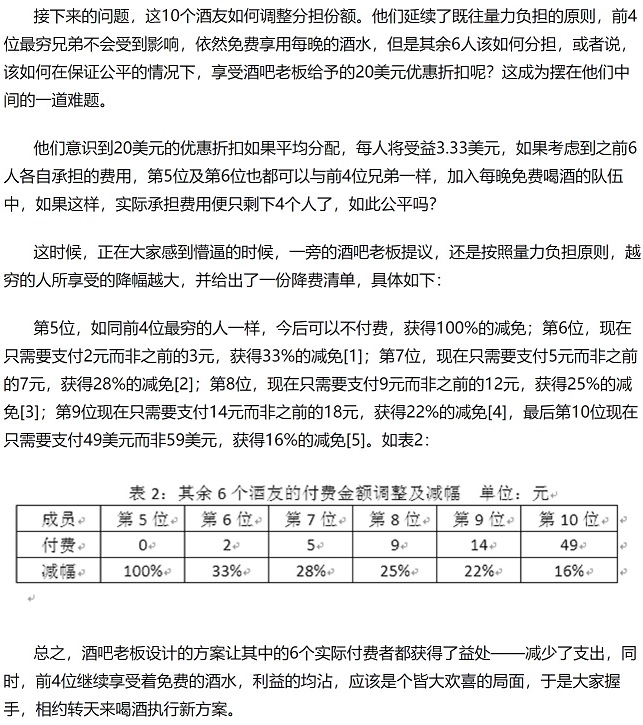 其次,十个酒友的寓言故事有个严重的逻辑矛盾。在人均100元收费时,大家量力而出,成为共识。这个共识在数学上就是一个相对比例。简单地说,如果人人都多出一倍,这个相对比例不变。如果人人都少出一半,这个相对比例也不变。后来酒店人均折价20元,也就是减价20%,根据共识如此数学类推,人人少交20%,问题就解决了。如果寓言故事里出了问题,产生纠葛,那就意味者他们从来就没有什么共识,因此一起喝酒的前提语境也不存在,后来大家得多花钱的尴尬也没有参照系。