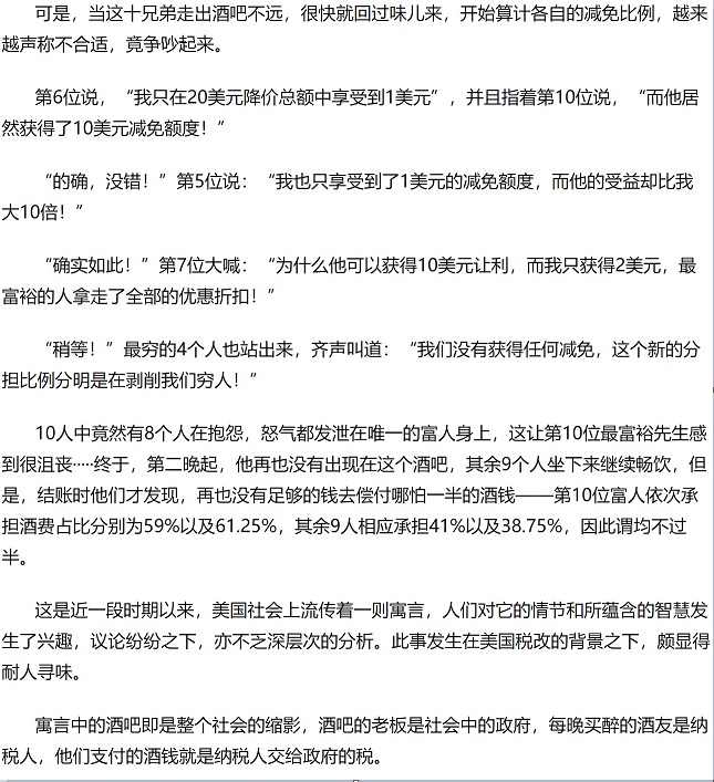 但有些宣传比较隐性,比如十个酒友的寓言故事(见图一,二,三)。这个故事说有十个酒友每次喝酒均量力而行,富人多出钱,穷人少出钱。后来酒店老板送大礼,愿意平均每人少收20元。十个人对如何分配这少收的钱起了争论,最后富人不爽,不来了。余下的人发现他们平均得多交钱了。这个寓言的中心思想是如果得罪了富人,大家都遭殃,因此在减税问题上,让富人开心,很有必要。