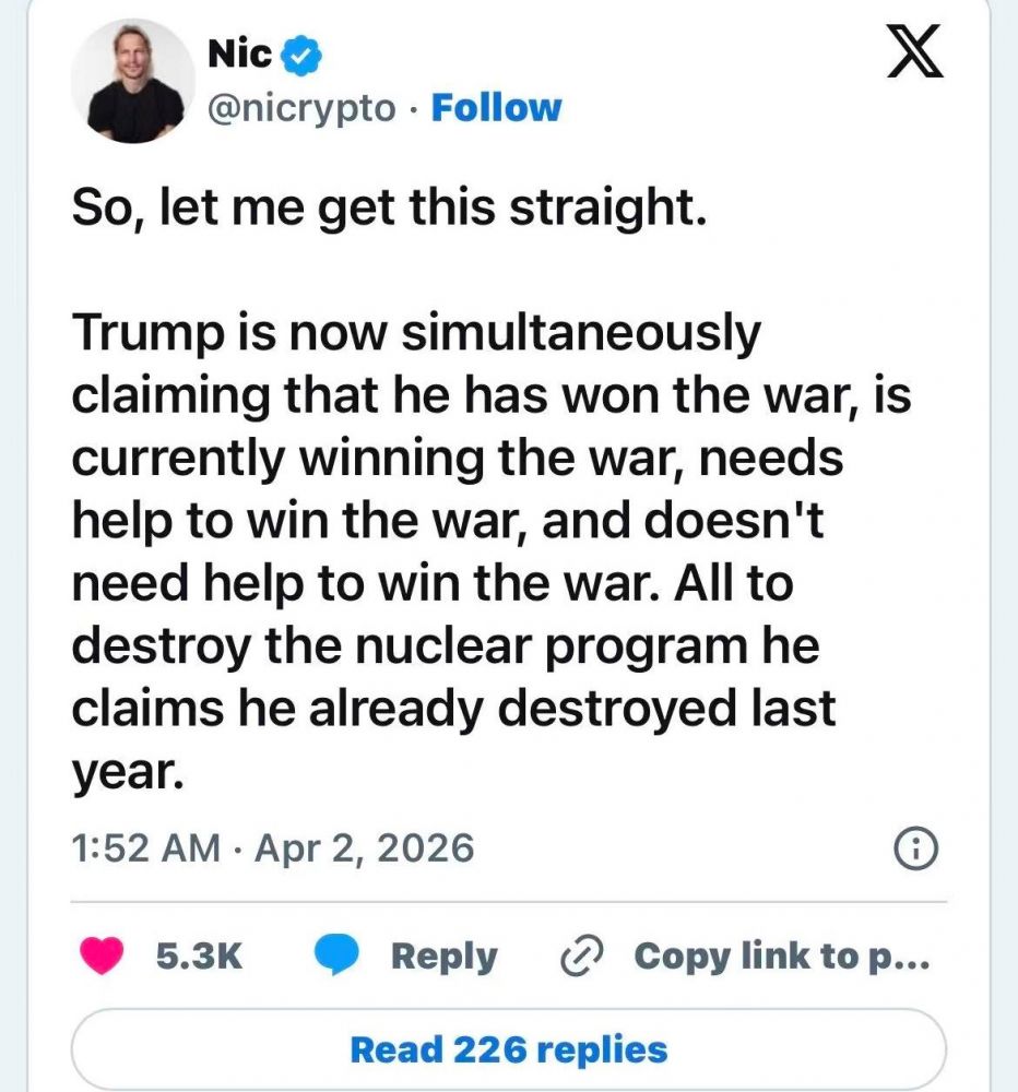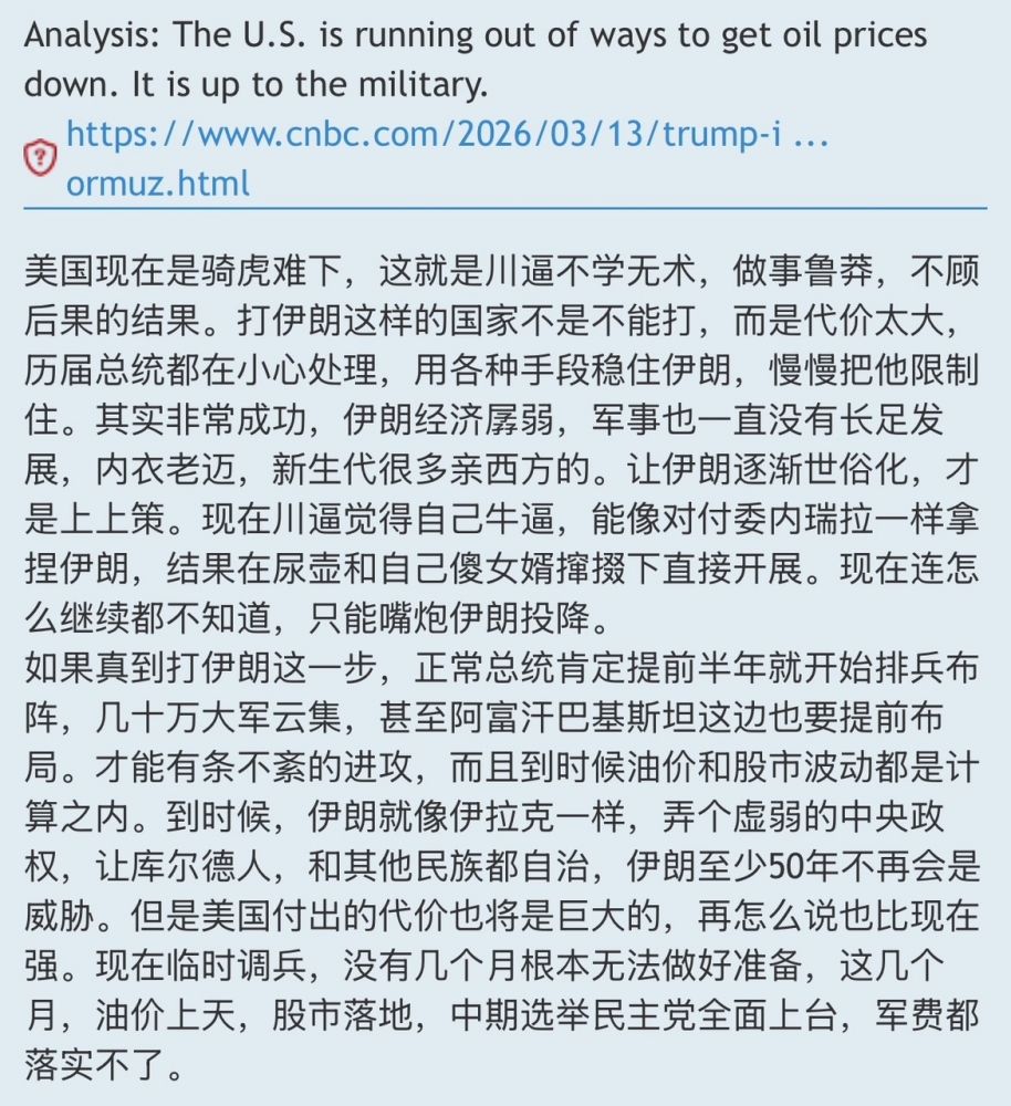 正如爪哥所料,川普既然被内躺夜壶绑架到对伊朗实行灭国战争的火山口上,就已经没有TACO的选择,打一半儿就想撤?霍尔木兹海峡不开通就想撤?门儿都没有!