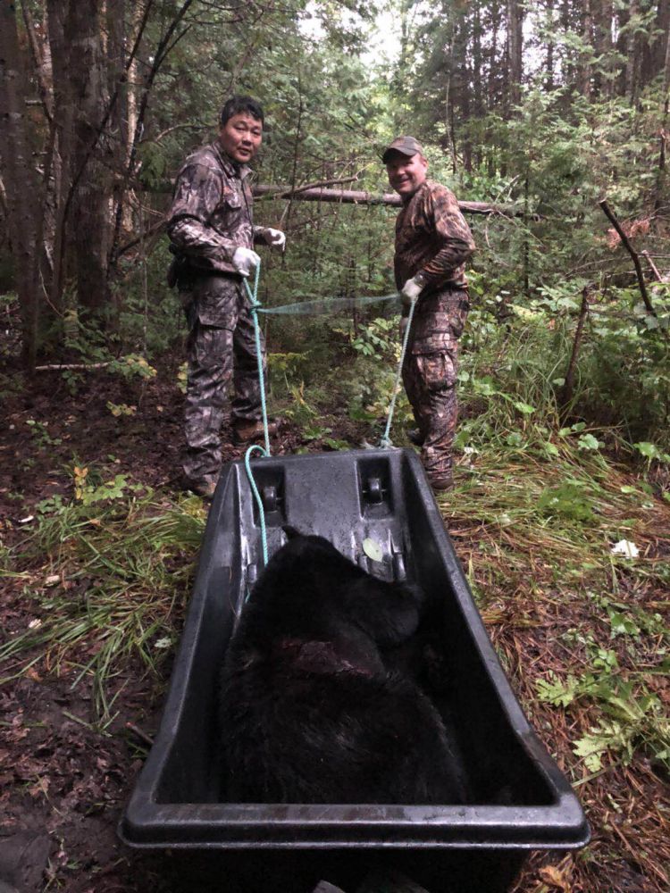 5:30雨停了我让儿子睡一下,6点一头熊从bait旁边的沼泽地走出来,估计已经在附近徘徊很久了我一直没有发现。然后熊四周看了一下直接冲向放食物的桶,一巴掌把盖子打掉站起来把头埋进桶里吃东西。心跳加块血液加速开始兴奋紧张的手也开始发抖。儿子也看到了紧张到僵住了,颤抖着把枪架好交到儿子手里,儿子已经紧张的不会动了,枪也忘了拿。我推了他几次可能声音大了一些,熊听到后四处看了看跑掉了。我和儿子的紧张兴奋还没有平复就开始失望,谁知道过了两分钟熊又回来了,可能是食物的诱惑太大了,也可能是之前跑开是对危险的试探。熊又开始吃东西,这次我果断开枪,不能再有任何失误。瞄准,调整呼吸,一枪命中心肺,子弹从前胸进入右后方穿出。熊跳了一下打了一个滚就起不来了。一般熊心肺中弹后会跑30-50码才会倒地,而这只熊没有跑直接原地毙命,没有任何痛苦。可能是我打的位置贯穿了多个重要器官。再之后就是把熊拖出树林,装车,去Check station 登记,把一颗牙撬出来给州政府查年龄,回到营地...