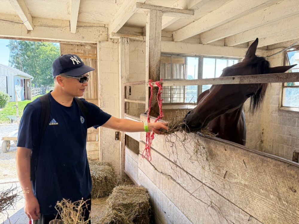 虽说母牛们现在对爪哥一万个放心,农场里的高头大马们,无论公母,都对爪哥侧目而视,倍加警惕。俺们的导游,农场主的大闺女,amish小美女Rebecca(后文会有介绍)驾着两匹高头大马拉着hay wagon,带着俺们环游农场之后,我问她,能不能让俺拍拍马屁股。Rebecca说:我看了你鉴的waiver。你最多只能摸摸马头。马屁股还是别拍了。动机不纯,小心挨踢。