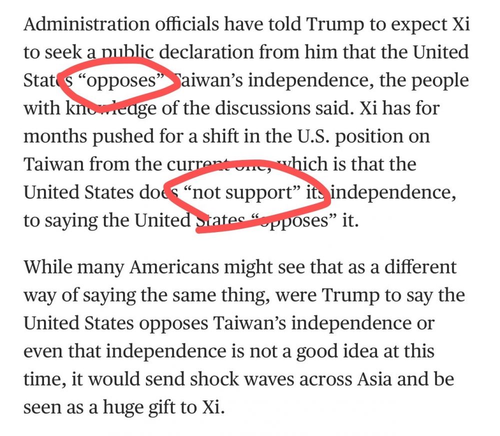 - - - 中方之所以单方面做出如此巨大的让步,是因为老川私下答应老习(请注意,老川白宫幕僚们集体反对,但无法阻止老川一意孤行),他在川习会时,会公开宣布,把美国“不支持”台湾独立,改为美国“反对”台湾独立。- - -