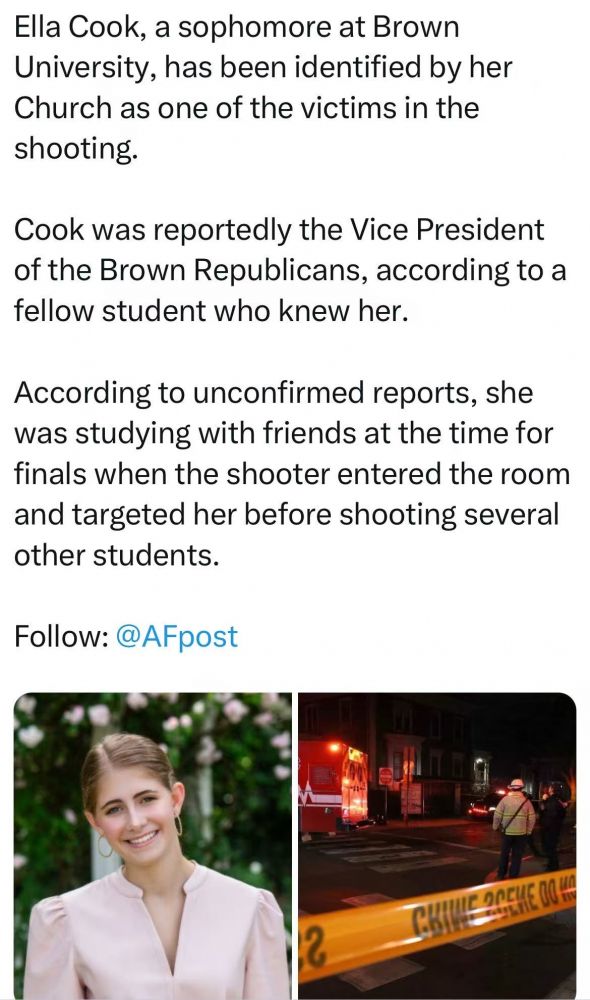 尤其是死者之一的女生 Ella Cook,是布朗这个美国最 liberal 的 college 的屈指可数的保守派学生,是 brown republican 的 VP,川普的支持者。