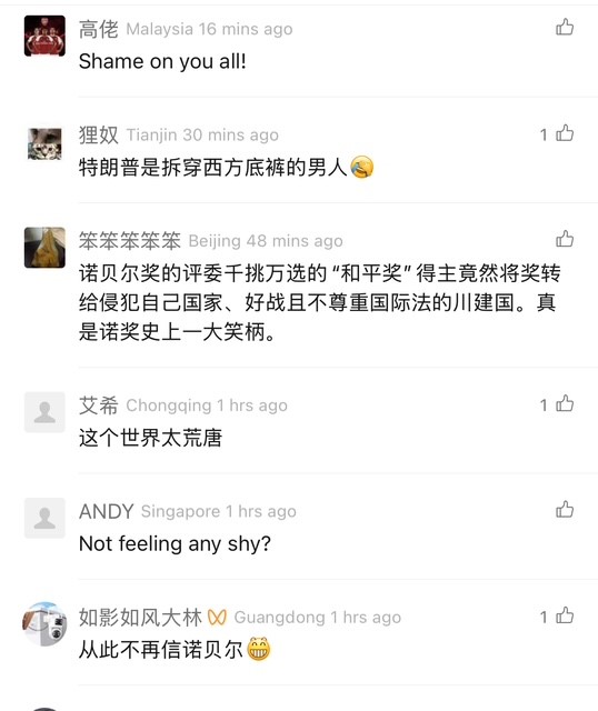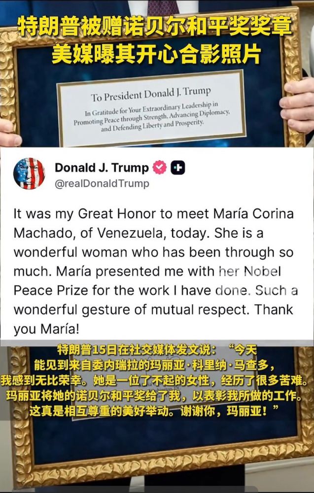 我擦,诺贝尔奖的评委们费尽心机挑选出来的“和平奖”得主,竟然将自己的奖章转送给了侵犯自己国家,穷兵黩武,丝毫不尊重国际法,而且是诺奖评委们非常不喜欢的川普。