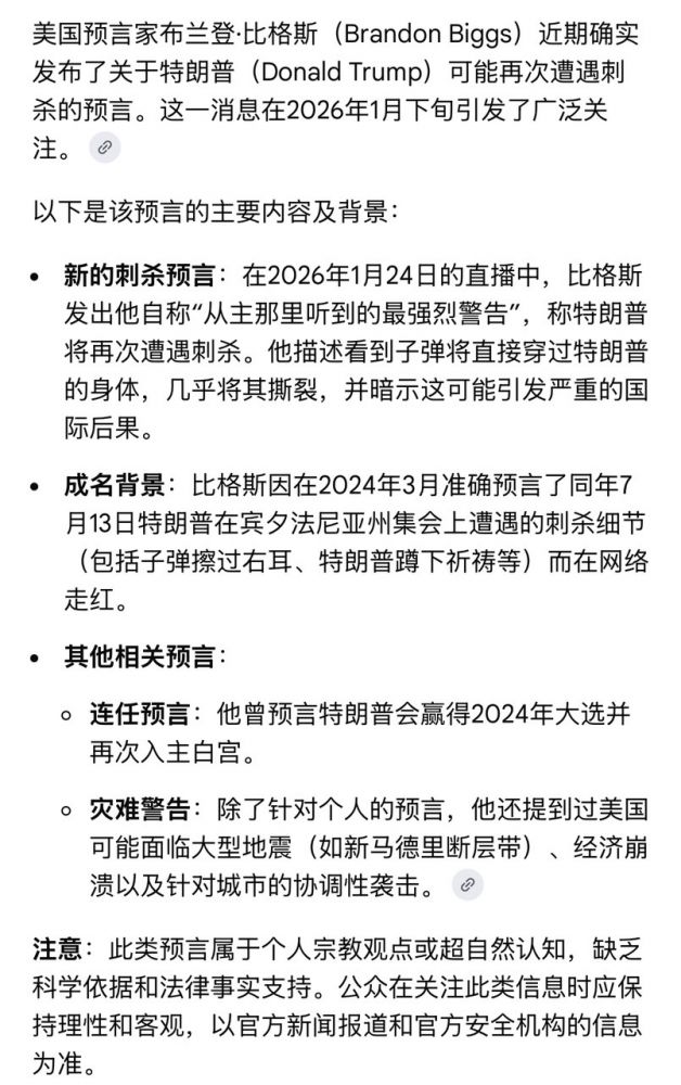 因为在2024年“精准预言”川普遭刺杀,被子弹擦伤右耳的神棍比格斯,最近可能吃黄豆吃多了,又发出惊天预言: