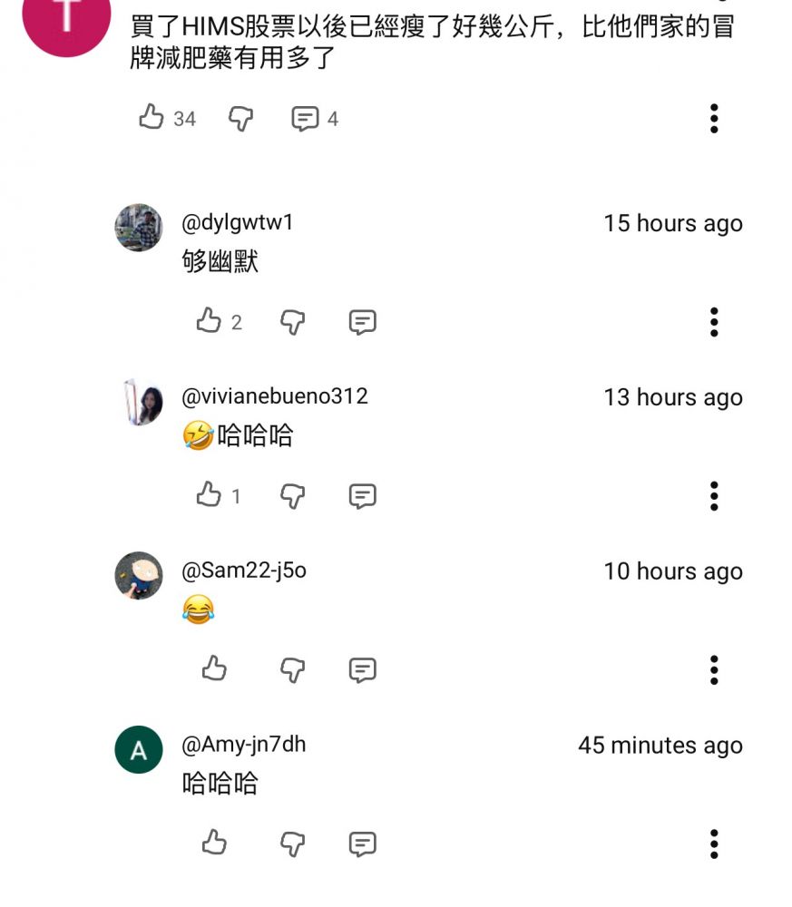 “买了HIMS 股票以后已经瘦了好几公斤,比它们家的冒牌减肥药有用多了。”