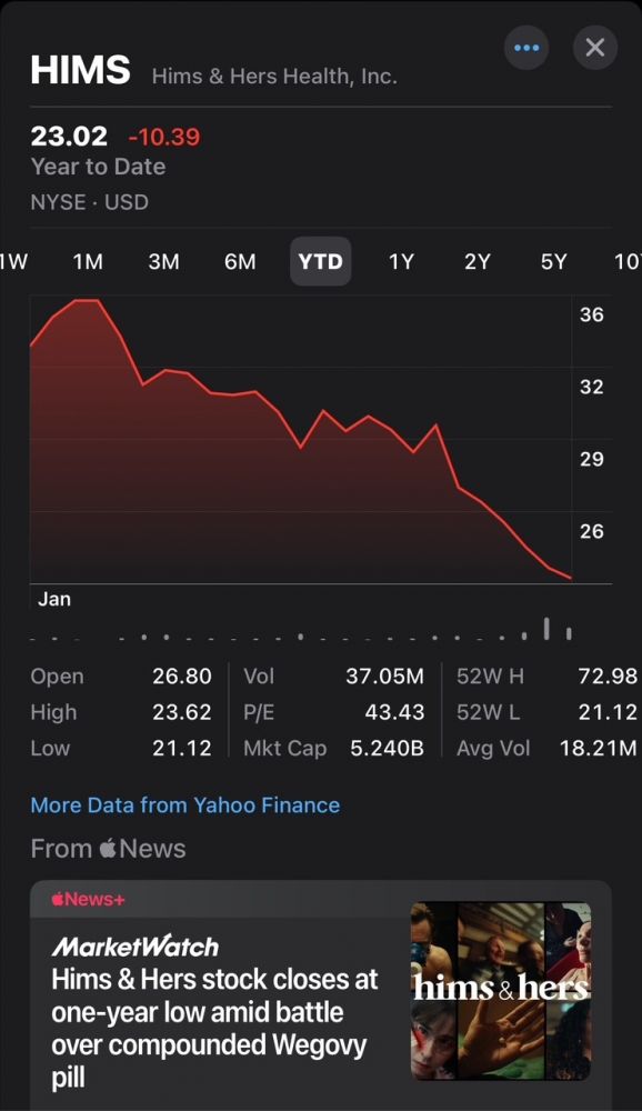 自打Hims & Hers的CEO勇敢地站出来,公开表态反对以色列在加沙的genocide之后(全美国成千上万的上市公司,有胆量公开表态的,廖廖无几,costo算另一家),股票就一直跌跌不休,从72跌到了21,跌到让股民怀疑人生。