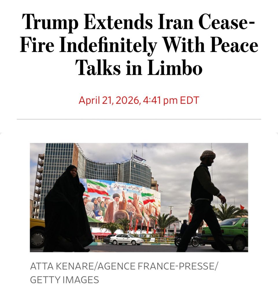 在美伊两周临时停火协议马上要过期(今天早晨)之际,老川昨天下午五点半发推宣布,将无限期延长美伊停火协议,直到伊朗回到谈判桌为止….