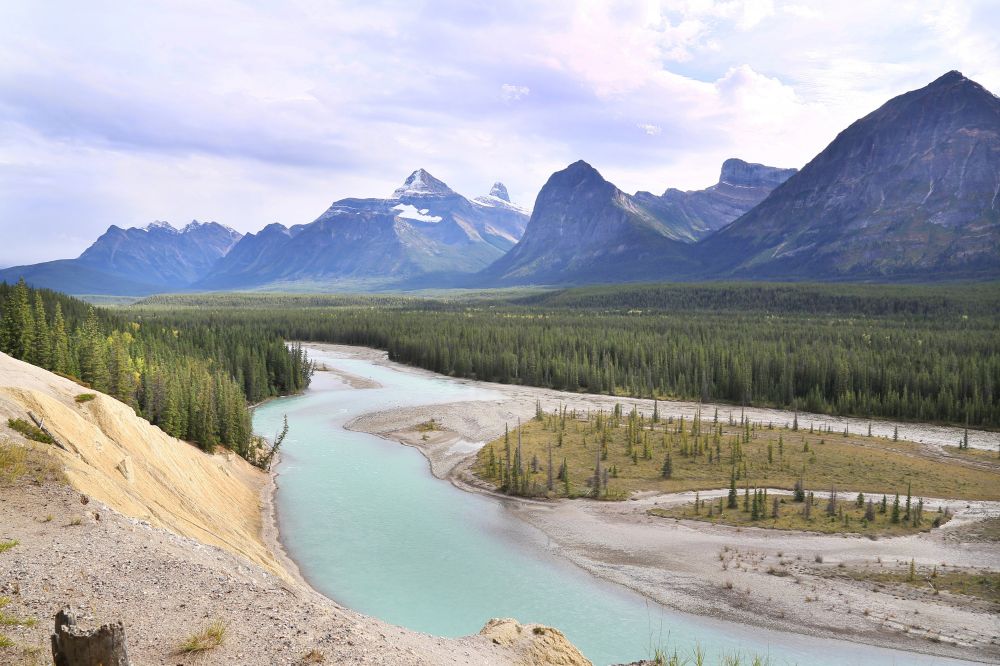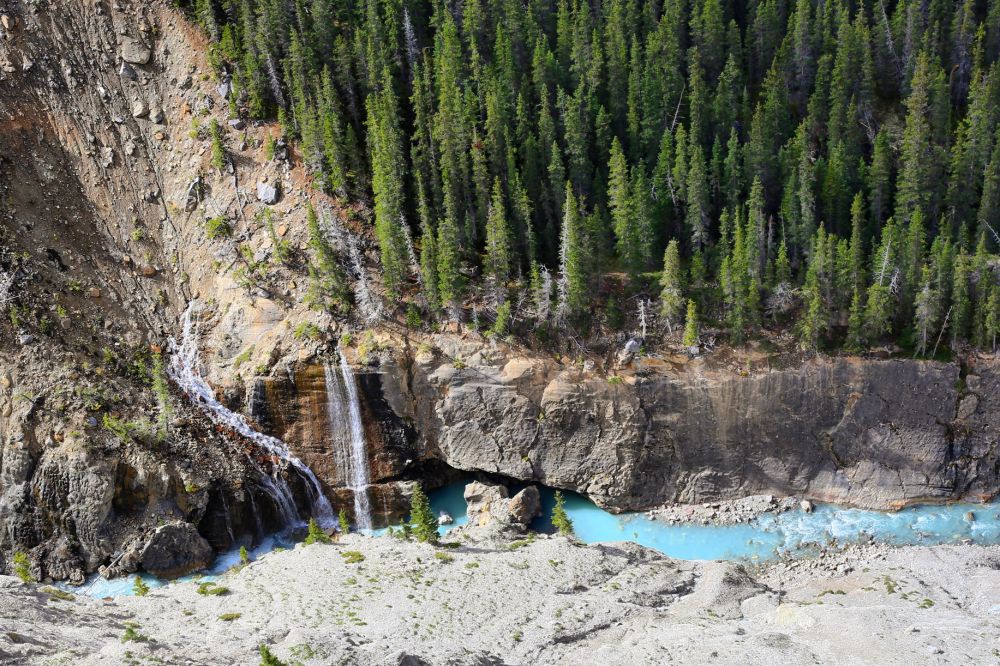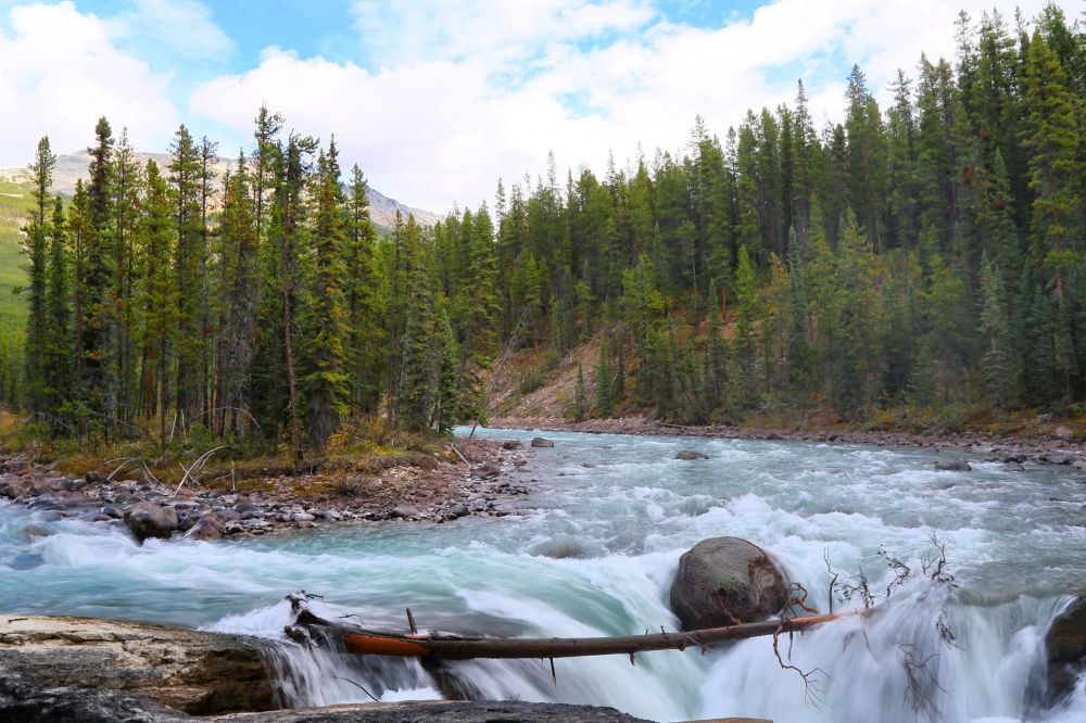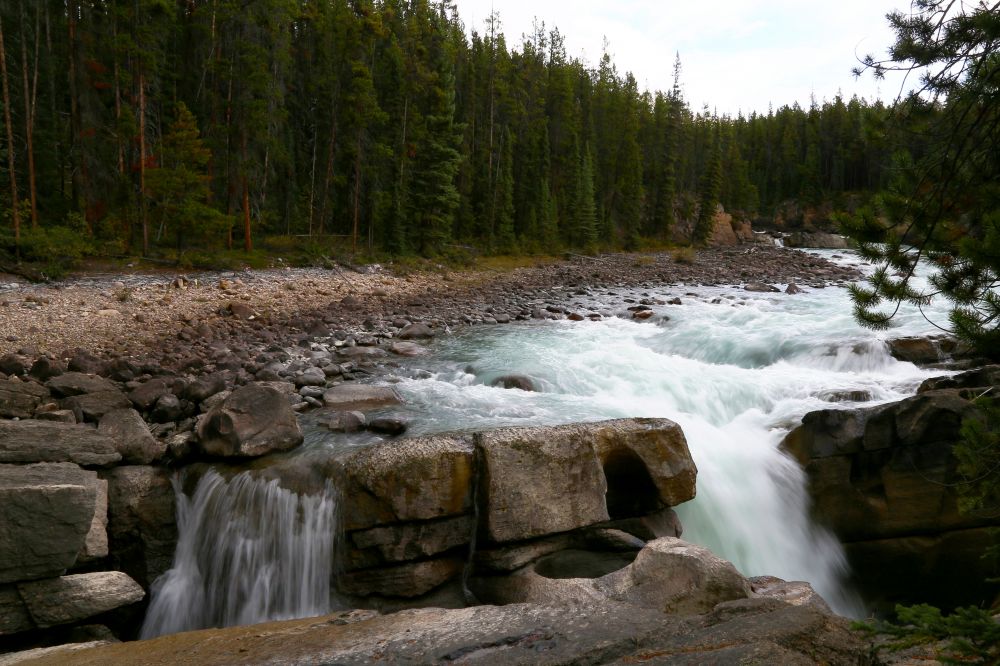 从Columbia Icefield出来到Jasper的最后100公里,沿着由冰川融水汇成的Athabasca River一路向北,看着Athabasca River由源头处几道细细的小溪流汇成最后宽阔的Athabasca River,最后会形成壮观的Athabasca Falls。