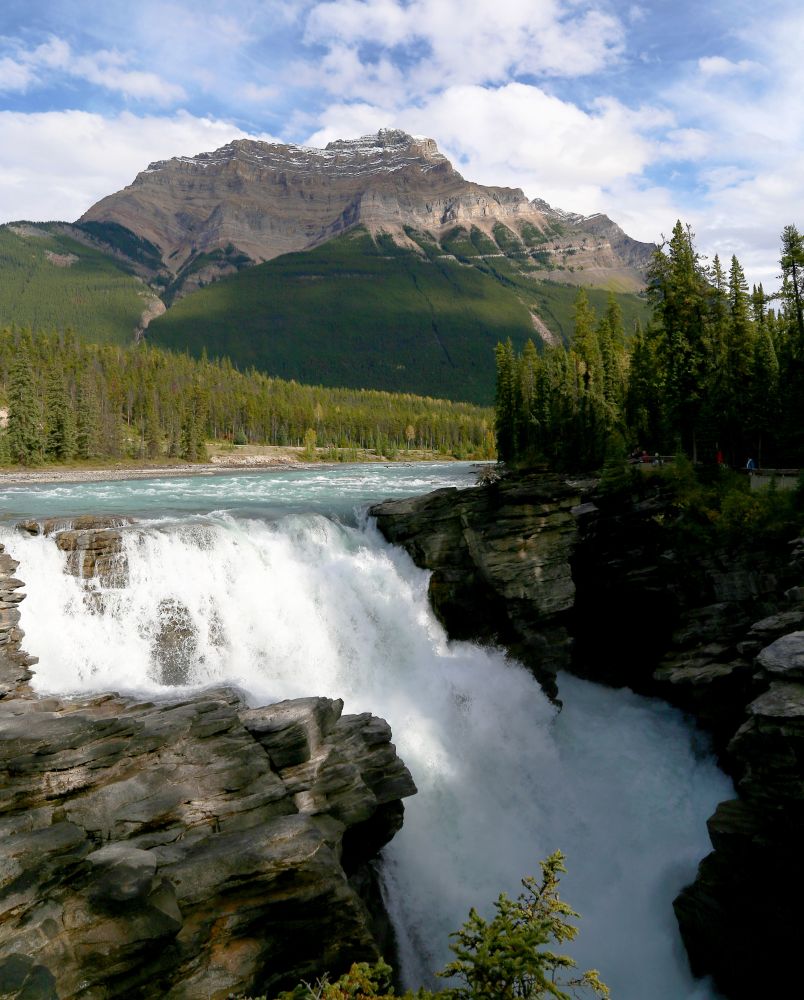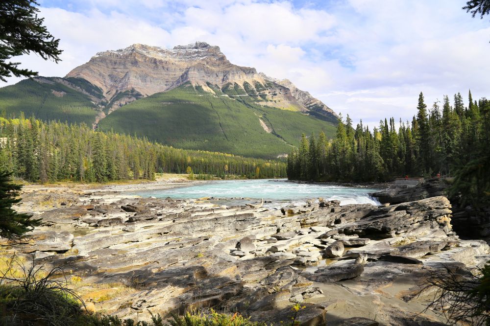 Athabasca Falls比Sunwapta Falls更开阔也更壮观。据说在Athabasca Falls下游有14种原生鱼种,而在瀑布上游只有一种鳟鱼。可是在不知道多少万年前,瀑布的上游是冰封万里,按理说是没有任何生物的,这唯一一种鳟鱼是怎么越过这么大的瀑布来到上游,至今也是一个未解之谜。