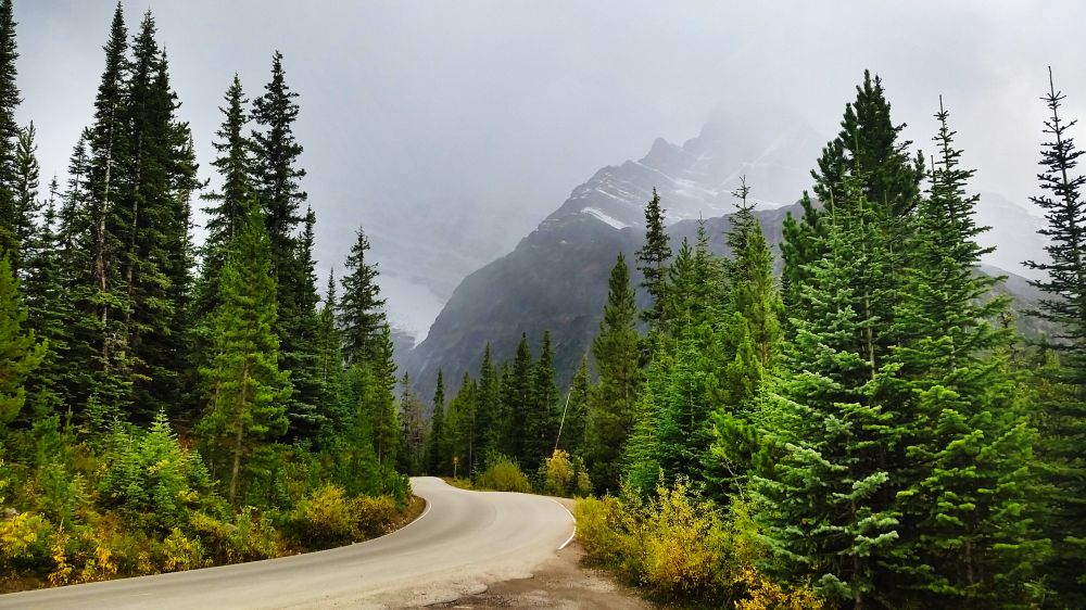 可惜这时云雾缭绕,树后远山丝毫不见,感觉一路上也没什么特别,好像和在安省的树林里开车也差不多的感觉。路上很多lookout,我们停下来却不知道要看些什么,后来才反应过来,这应该是看远处的雪山的,因为天气的原因,我们现在却什么都看不见。